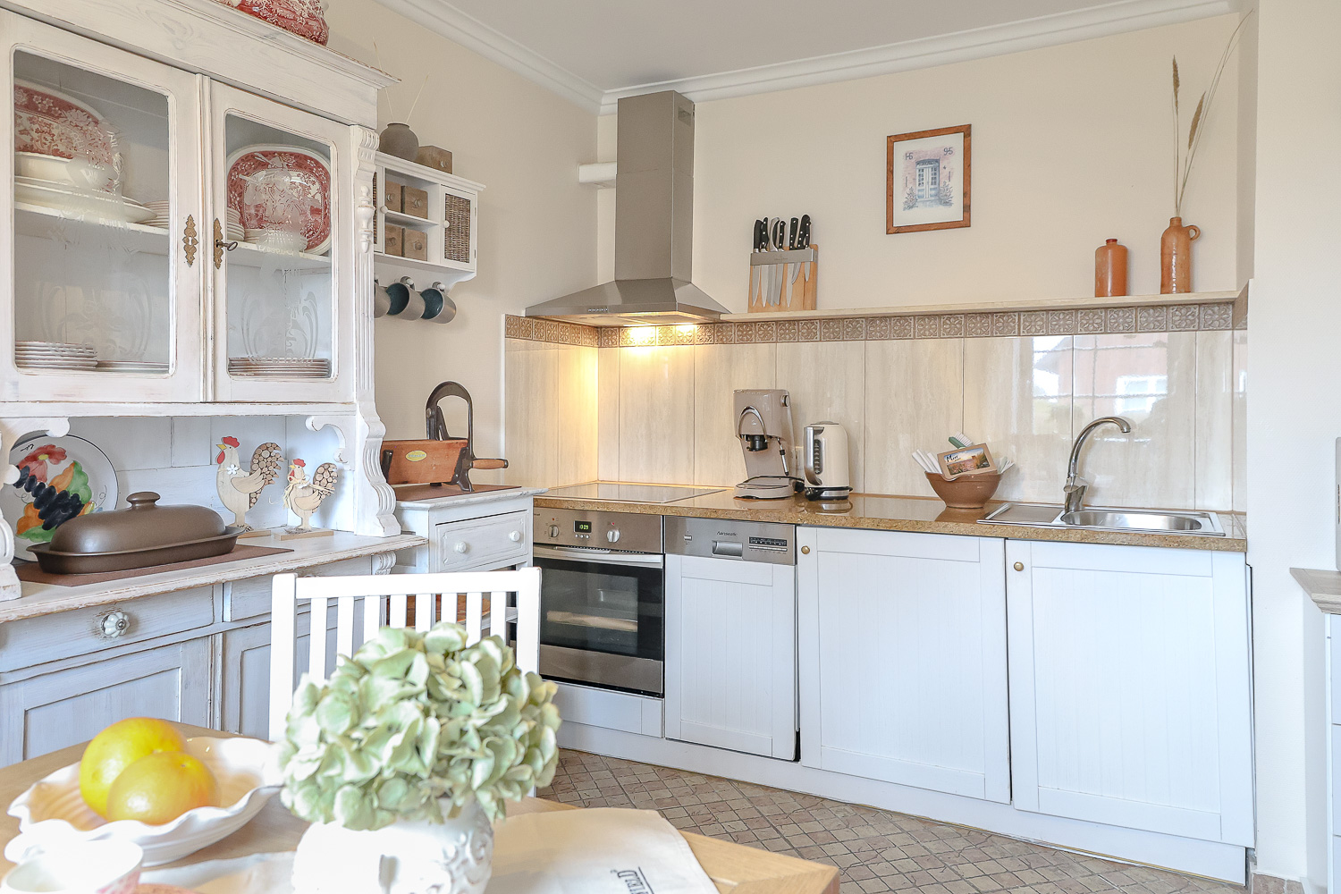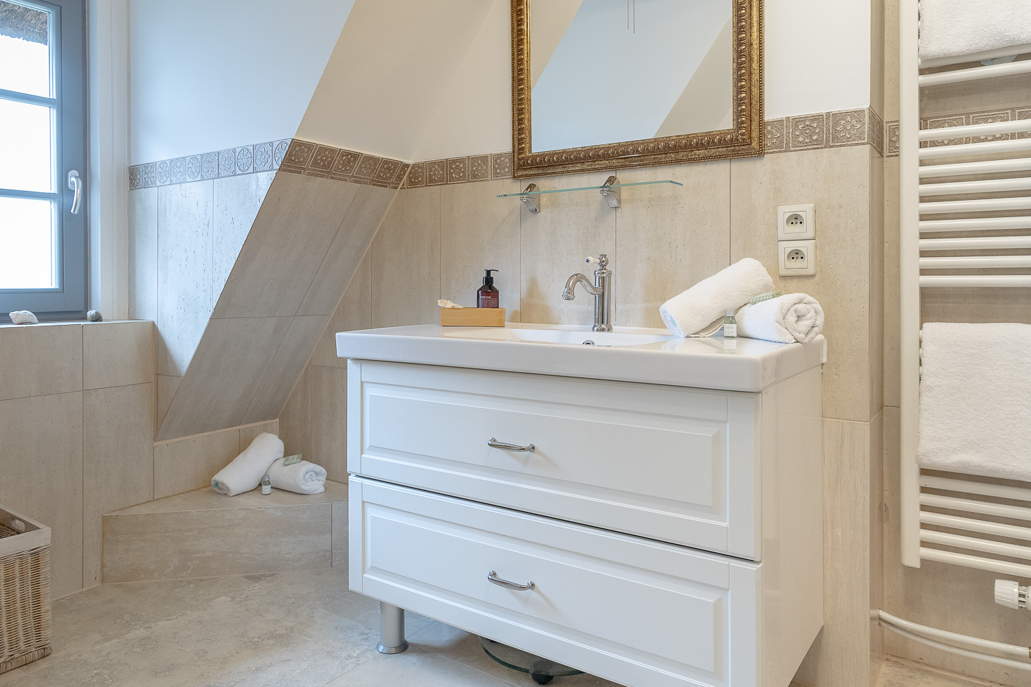 Das Feriendomizil verfügt über ein Schlafzimmer mit Doppelbett sowie zwei Schlafzimmer mit jeweils zwei Einzelbetten. Zwei Duschbäder mit WC sowie ein zusätzliches Gäste-WC bieten hohen Komfort – ideal für Familien oder den Urlaub mit Freunden.
