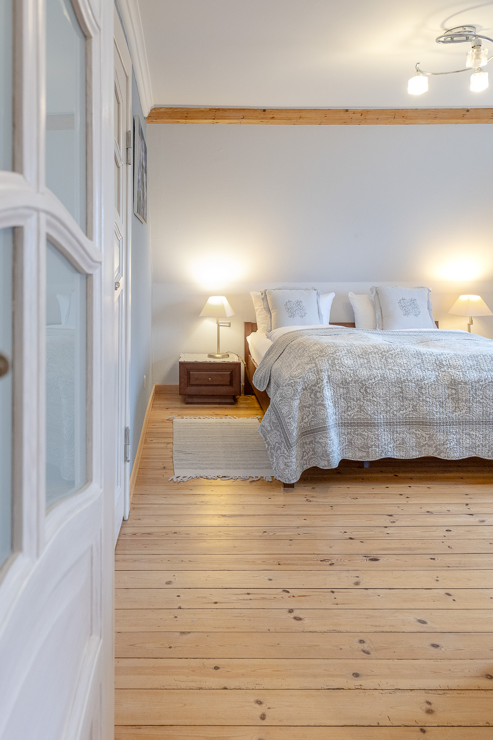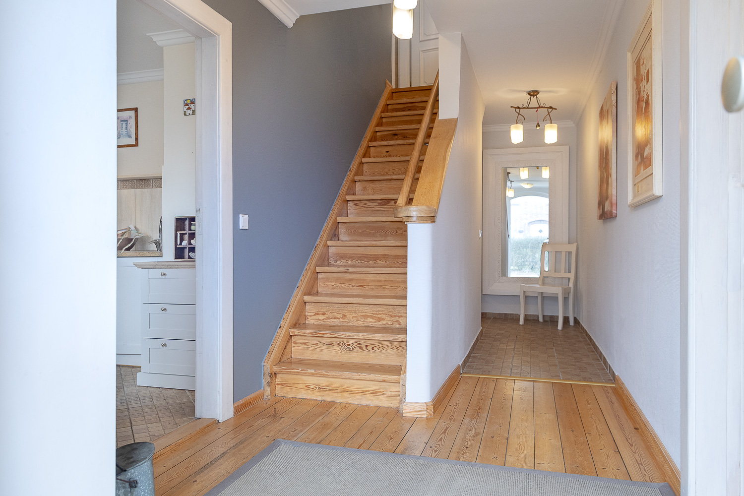Die natürliche Ausstrahlung des Hauses, kombiniert mit modernem Wohnkomfort, schafft einen Ort zum Abschalten und Durchatmen. Der originale Holzboden, helle Farben und Einrichtung sorgen für eine warme, einladende Atmosphäre. Große Fenster öffnen den Blick in die Natur und lassen viel Licht ins Haus.