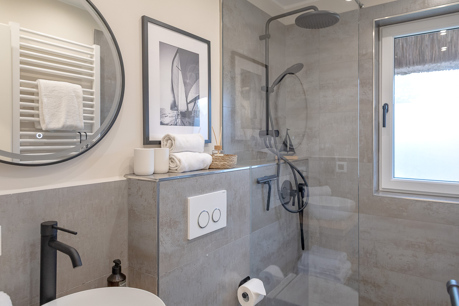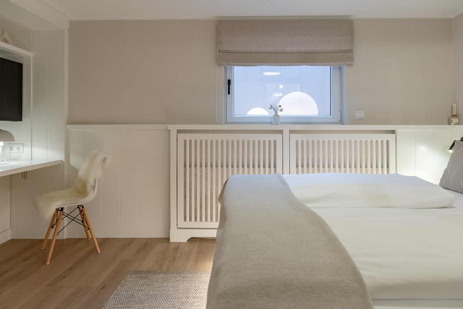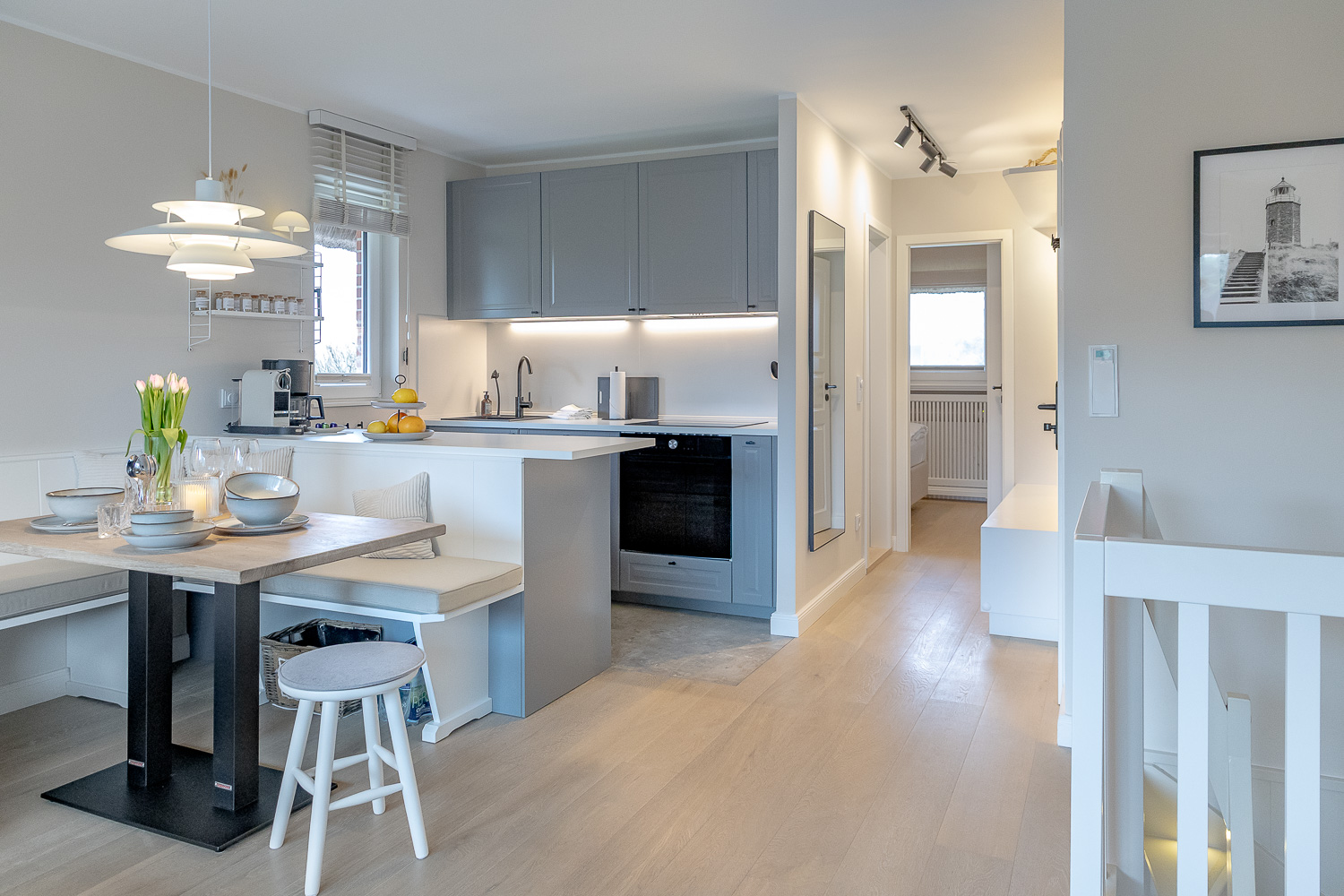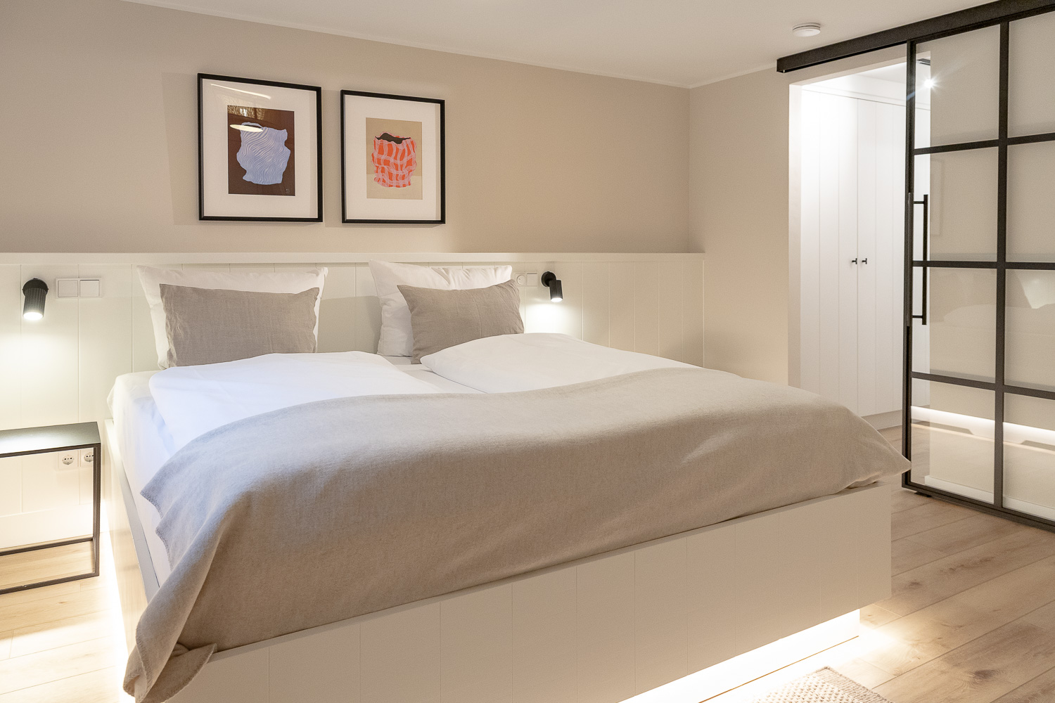 Die helle, offen gestaltete Wohnküche bildet das Herz der Wohnung. Hochwertige Materialien, moderne Geräte und ein gemütliche Wohn und Essbereich laden dazu ein, gemeinsame Momente zu genießen - vom entspannten Frühstück bis hin zum Kochabend im kleinen Kreis. Die Friesenkoje verfügt über zwei separate Schlafzimmer sowie über zwei moderne Duschbäder mit WC, so dass auch Familien oder befreundete Paare genügend Privatsphäre haben. Ein besonderes Highlight ist die private Sauna, die nach einen Tag am Meer für tiefe Entspannung sorgt.