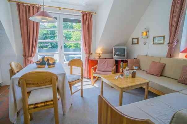 OG/DG-Nichtraucher-Whg. mit eigenem Eingang, ca. 55 qm, integrierte neue Küche im Wohnraum mit Esstisch für 4 Personen, Backofen, Geschirrspüler, Kaffeemaschine, Wasserkocher, Kühlschrank, Mikrowelle, Herd, Wohnraum mit Kabel-Farb- TV, Telefon ( 04651-44166) & Eckcouch.