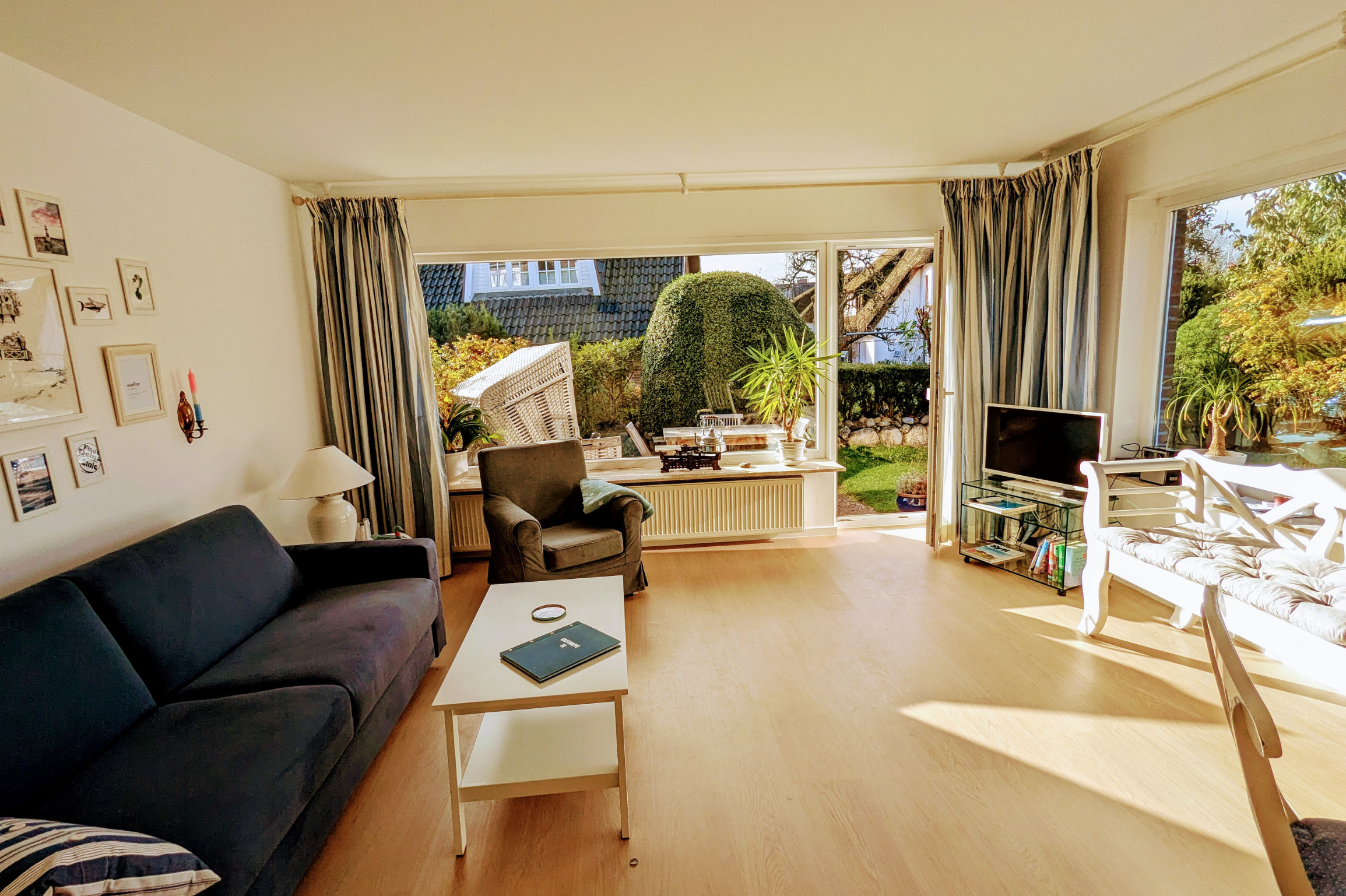 Genießen Sie den direkten Zugang zu Ihrer eigenen Sonnenterrasse vom Wohnzimmer aus. Die Terrasse ist ausgestattet mit einem gemütlichen Strandkorb, einem Tisch und Stühlen, ideal für entspannte Stunden im Freien.