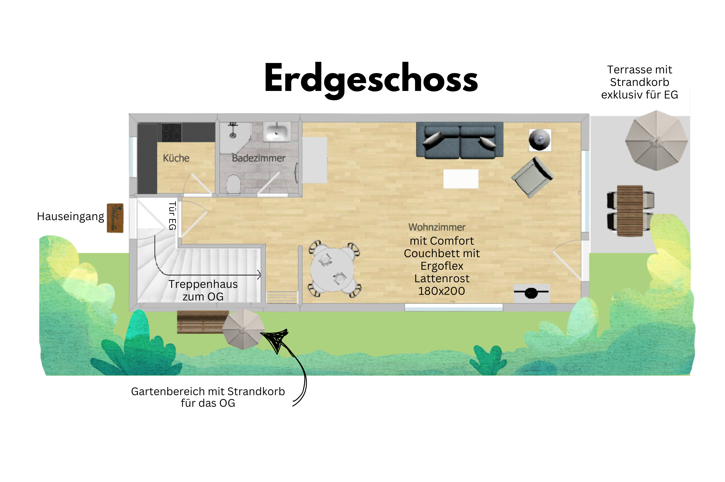 Genießen Sie den direkten Zugang zu Ihrer eigenen Sonnenterrasse, ausgestattet mit einem gemütlichen Strandkorb, einem Tisch und Stühlen, ideal für entspannte Stunden im Freien.